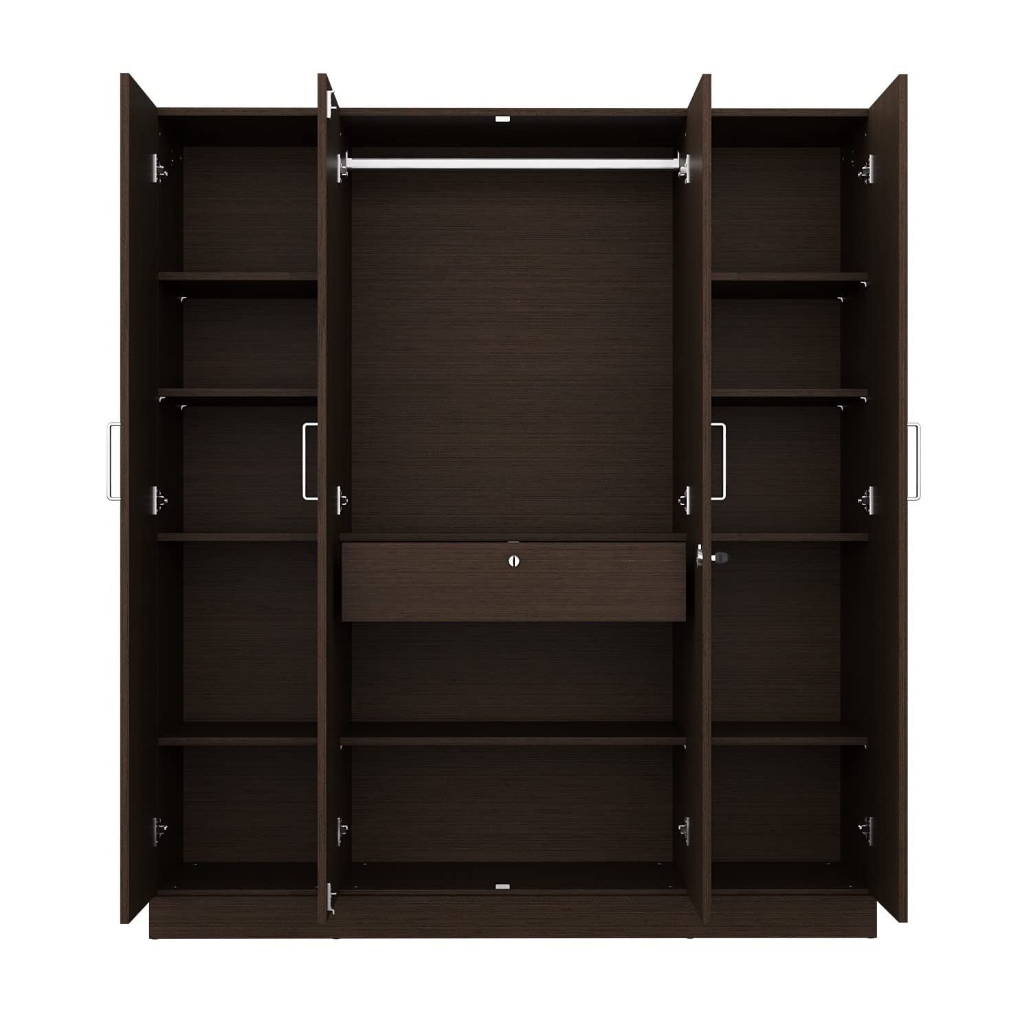 Transform your bedroom into a sophisticated living space with this premium 4-door wooden wardrobe. Crafted with a rich dark walnut finish, this wardrobe delivers timeless elegance while providing generous storage for all your essentials.